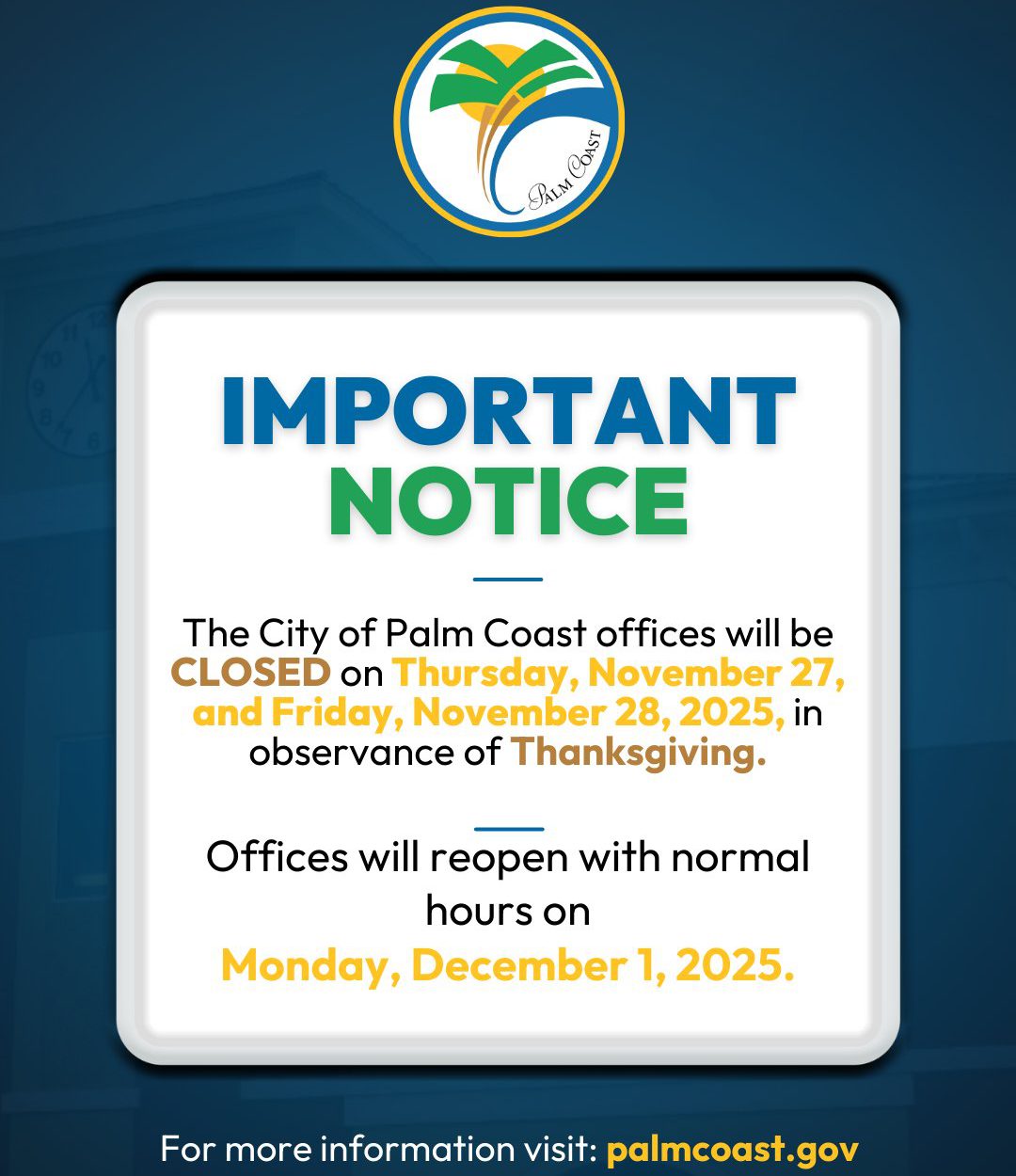 Palm Coast – In observance of Thanksgiving, the City of Palm Coast is adjusting operating hours and announcing facility closures for Thursday, November 27, and Friday, November 28, 2025. Closures on […]