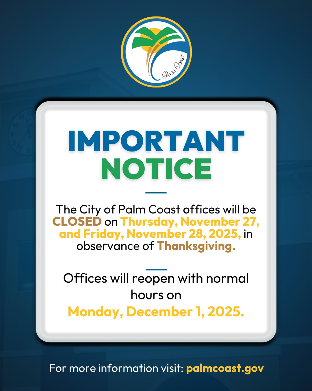 City of Palm Coast Offices Closed Thursday and Friday in Observance of the Thanksgiving Holiday