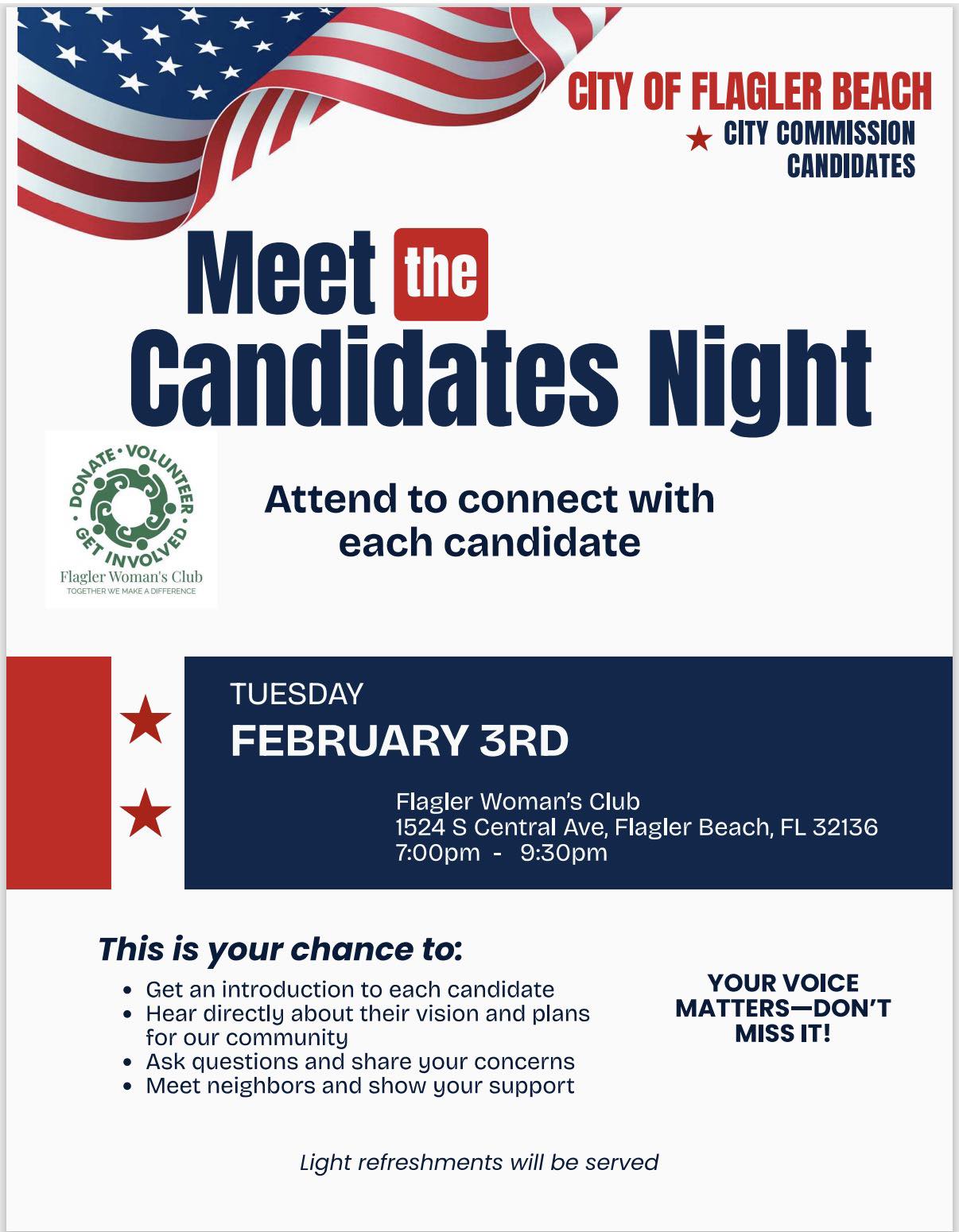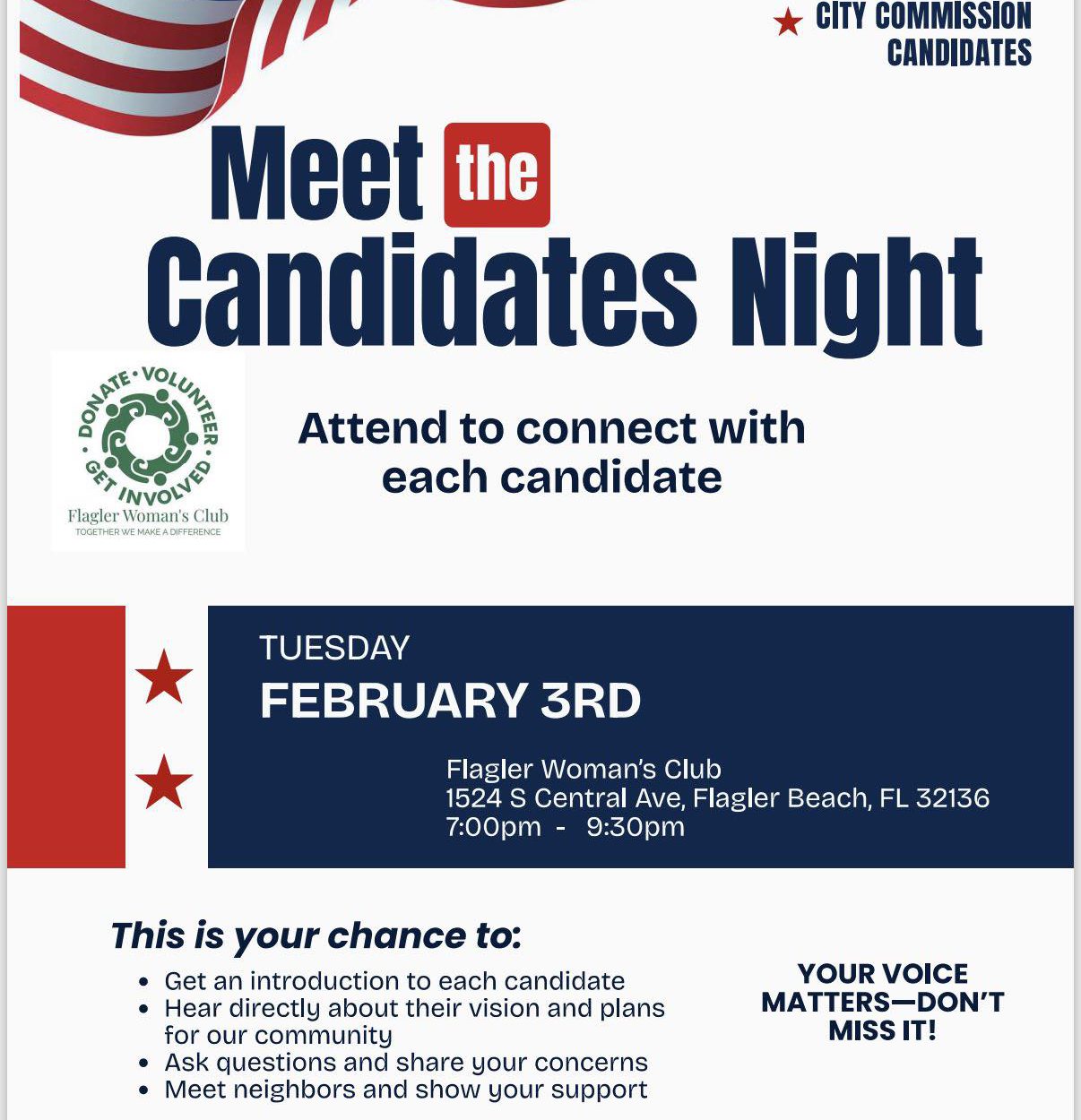 Posted in Flagler News Weekly Flagler Woman’s Club to Host Candidate Meet & Greet January 29, 2026 Come meet the candidates for Flagler Beach City commission on Tuesday, February 3 at 7:00 PM. Each candidate will introduce themselves and then there will be a question and answer […]