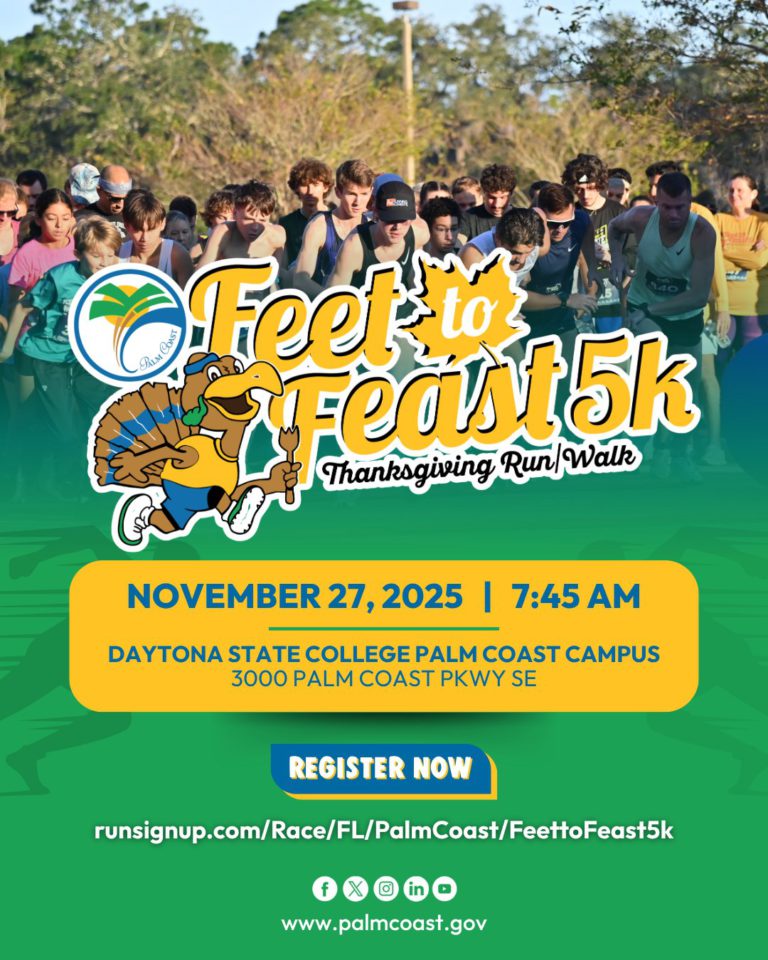 Palm Coast – Just like Thanksgiving leftovers, great deals don’t last long — and the early-bird registration for the 2025 Feet to Feast 5k is about to disappear. Residents have until Monday,…