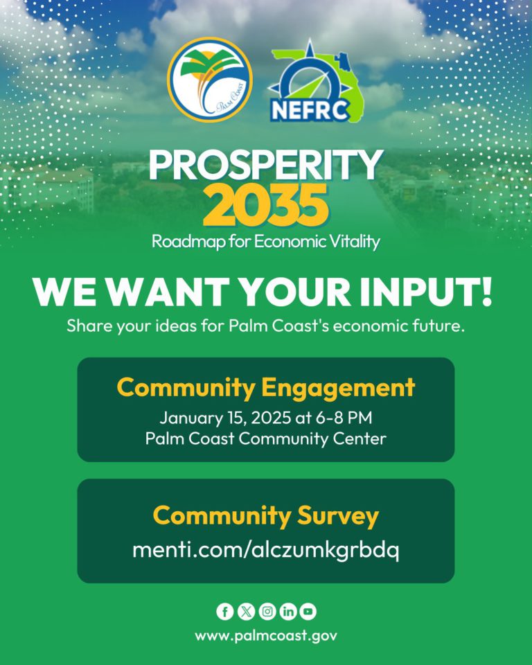 Palm Coast, FL— The City of Palm Coast invites residents, business owners, and community leaders to attend the final community engagement session for the Community-Driven Economic Development Vision Plan, Prosperity…
