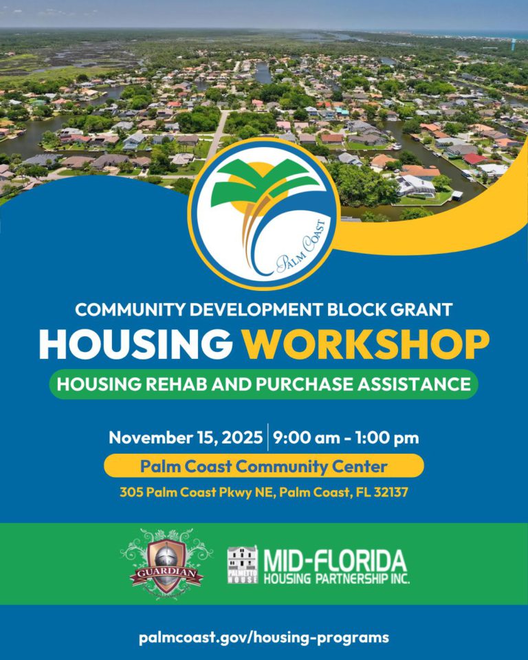 Join the City of Palm Coast for the Community Development Block Grant Housing Workshop this Saturday, November 15, 2025. Discover how you might qualify for housing rehab and purchase assistance…